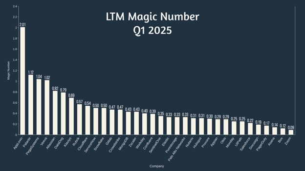 Magic number, which measures how much net new ARR is generated per $1 spent on sales and marketing, tells a similar story: the median dropped from $0.52 in Q1 2023 to $0.37 in Q1 2025 - a 29% decline in two years.