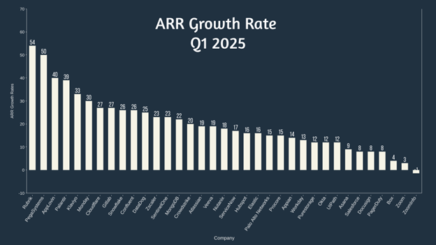 Several, like Asana, DocuSign, PagerDuty, Box, and Zoom, are growing under 10%, with ZoomInfo even seeing negative growth (-1.3%).